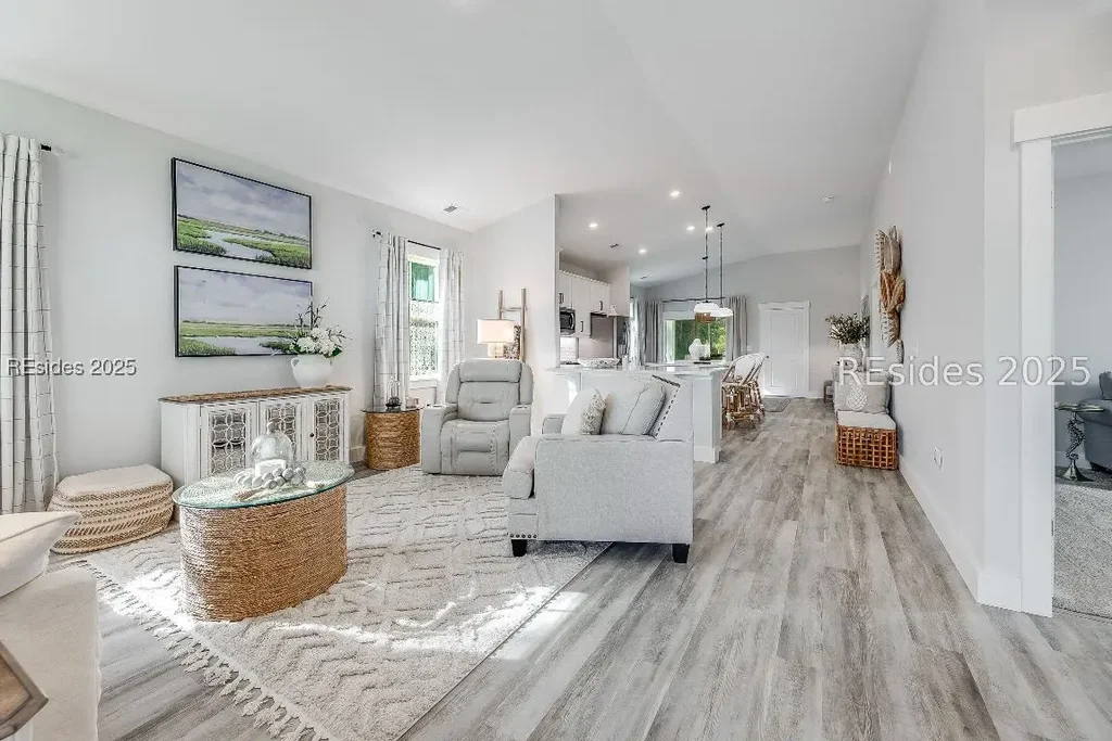 Cottage style, single story home exudes Lowcountry charm! Situated on a corner homesite in the boutique River Oaks neighborhood, this bright, airy home is filled with natural light and designer upgrades. Inside, you'll find craftsman baseboards and window sills, cottage-style trim, beadboard accents, wainscoting, and statement lighting throughout. The kitchen is a focal point, exuding luxury with quartz countertops, 42" cabinets, under-cabinet lighting, custom backsplash, and premium hardware. Wake up to serene sunrise views over the lagoon from your front porch, then stroll the neighborhood's sidewalks winding past peaceful lagoons and majestic Live Oaks. River Oaks sits quietly at the end of a street that meets the scenic Okatie River, offering Beaufort County living with access to Bluffton Schools. Here, small neighborhood charm meets the best of Lowcountry convenience.