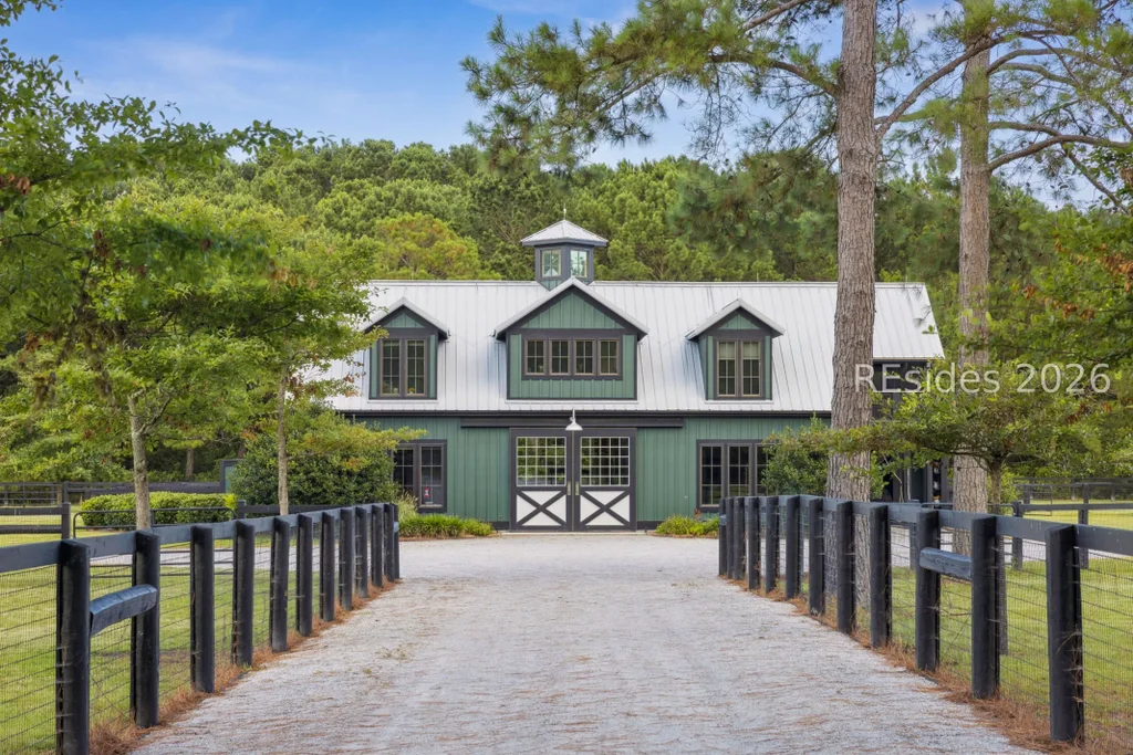 1 Straight Road is a meticulously designed 10 acre equestrian estate showcasing exceptional quality throughout. The property features four irrigated Bahia grass paddocks, each equipped with automatic waterers connected to city water. One paddock, conveniently located near the barn, includes a 60 foot round pen. At the heart of the property is an award winning four stall center isle barn with spacious living quarters above. The barn offers two full size 12x14 stalls on each side, all with direct access to outside turnout. The ground level includes equipment and carriage storage, a conditioned office, full bath, tack room, feed room, and a covered wash stall, providing both functionality and comfort. Upstairs, the 1,120 square foot apartment features a living room, dining area, bedroom, bathroom, and a generous screened porch, creating a private and inviting residence overlooking the grounds. Near the entrance to the property is a separate storage barn with two bays and covered horse trailer parking. Attached is a conditioned greenhouse, and nearby sits a well organized garden with fifteen raised beds, all enclosed by an eight foot fence for protection. A tour of 1 Straight Road makes it clear that no detail was overlooked. This is a thoughtfully planned equestrian complex where quality craftsmanship and careful design come together seamlessly.